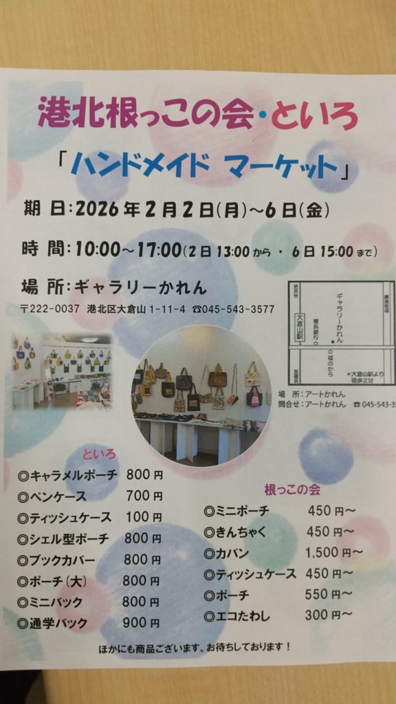港北根っこの会とといろ合同の販売会を行います。